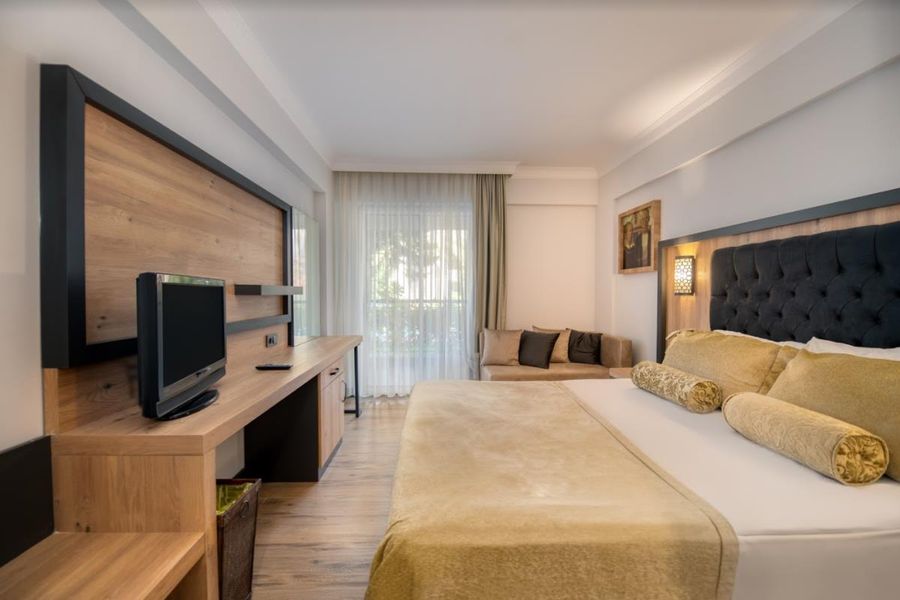 This attractive hotel is built on 30,000 square metres of land and is set in well-maintained gardens that stretch down to the private pebbly beach and sunbathing platform. Positioned by the sea, the hotel has the spectacular backdrop of the Taurus Mountains. Local transport can be taken in front of the hotel with connections to the resort centre and Antalya. The hotel is located 1 km from the centre of Kemer and 38 km from the city of Antalya and 55 km from Antalya Airport.The hotel was built in 2004. Guests are welcomed at the accommodation, which has a total of 332 rooms. In the air-conditioned establishment, travellers are welcomed at the reception area with 24-hour reception and a 24-hour check-in/check-out service. Most storeys are accessible by lift. Amenities include a safe and a currency exchange service. Wireless internet access in public areas allows guests to stay connected. Among the culinary options available at the hotel are a restaurant, a dining area, a breakfast room, a café, a bar and a pub. Various shops are available, including a supermarket and a souvenir shop. The grounds of the accommodation feature a playground and an attractive garden. Additional features at the establishment include a newspaper stand, a playroom and a library. Those arriving in their own vehicles can leave them in the car park of the hotel. Available services and facilities include multilingual staff, a babysitting service, a childcare service, medical assistance, room service, a laundry service and a hairdresser.Each of the rooms is appointed with air conditioning, central heating and a bathroom. Most rooms feature a balcony with a view for guests' enjoyment. Many rooms feature a sea view, which further enhances the ambience. The carpeted rooms have a double bed and a sofa bed. Separate bedrooms are also available. Cots and extra beds are available. A safe and a minibar are also available. A mini fridge and a tea/coffee station ensure a comfortable stay. Internet access, a telephone, a TV, a radio and WiFi add to the comfort of the holiday. Slippers are laid out in each of the rooms. Rooms suitable for wheelchair access are bookable. The bathrooms are fitted with a shower and a bathtub. A hairdryer, a vanity mirror and bathrobes are provided for everyday use. Bathrooms with wheelchair access can also be booked. Special family rooms are available for families with children.A refreshing dip in the indoor or outdoor pool is an enjoyable way to cool down on hot days. A waterslide offers fun for all ages. A terrace, sun loungers and parasols are available. The hot tub is the perfect place to relax. There is also a poolside snack bar. Variety is provided by the wide range of sporting activities offered at the accommodation, for example tennis, bocce, beach volleyball, volleyball, basketball and archery. Travellers at the establishment can choose from a range of water sports options, such as windsurfing and paddle boating, or for a fee, water skiing, jet skiing, motor boat rides, banana boat rides, canoeing, catamaraning, diving and aquafit. The hotel offers numerous indoor sporting opportunities, with activities such as a gym, table tennis, darts, yoga, gymnastics and aerobics, or for a fee, billiards. The accommodation offers a range of services in the wellness area, such as a spa, a sauna, a steam bath, a hammam, a beauty salon and a solarium, and for an additional fee, massage treatments. Other options and services include an entertainment programme, a disco, a kids' club and a kids' disco. Copyright GIATA 2004 - 2017. Multilingual, powered by www.giata.com for client no. 125125All-inclusive is bookable. Available meals include breakfast, lunch and dinner. Special meals, including special dietary cuisine, are also available. Snacks can be enjoyed at the establishment. Drinks are included in the price for guests. Alcohol-free drinks and alcoholic beverages are offered.The following credit cards are accepted at the hotel: VISA and MasterCard.